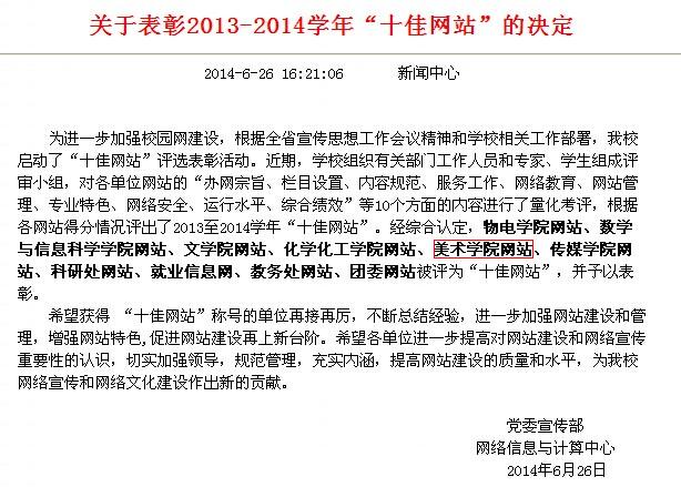 近日为进一步加强校园网建设,根据全省宣传思想工作会议精神和学校相关工作部署,学校启动了“十佳网站”评选表彰活动,美术学院主页在全校近五十个部门、教学单位网站中脱颖而出被评为学校“十佳网站”。