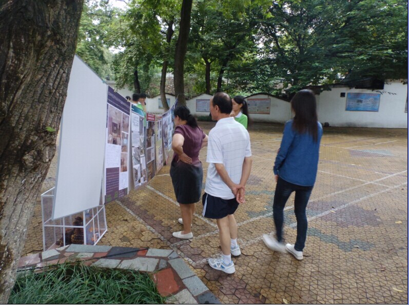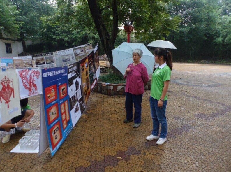 本次展览依托我院参加河南省第十四届科技文化艺术节中绘画、摄影、篆刻、书法、设计等优秀作品,结合我院2014年毕业生优秀毕业作品,实践小组成员充分利用各种资源,在浉河公园进行展览、讲解,并进行现场绘画、书法等活动,现场群众踊跃参观,现场观众络绎不绝,气氛热烈。之后进行的字画赠送活动使小组成员与群众充分互动,我院学生现场作画、写字,赠与围观群众。雅致的山川水墨画,遒劲的行书楷书,得到现场观众的一致好评和热烈掌声。