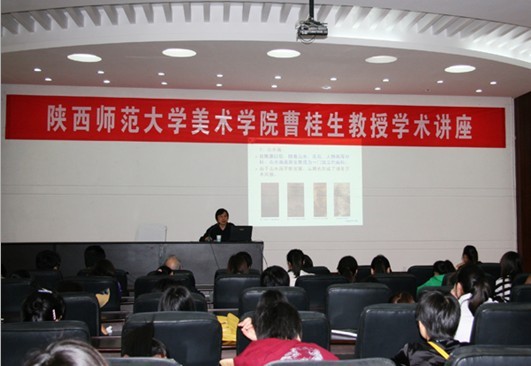 4月23日,应我校美术学院邀请,陕西师范大学美术学院曹桂生教授来我校讲学,在艺术楼报告厅作了题为“中国画的艺术与审美”的学术报告。报告由美术学院副院长汪俊林主持。报告中,曹桂生教授系统讲授了中国画艺术概说、中国画的审美取向、中国画的意象特征等理论知识。曹桂生教授授课声情并茂,使用丰富翔实的图文资料,不时赢得师生阵阵掌声。报告现场,他和师生探讨交流国画的创作技巧、方法等问题,向同学们讲述自己在创作中的一些体会。曹桂生教授还在美术学院临摹室现场挥毫,为同学们示范习作技巧。曹桂生,陕西师范大学美术研究所所长、陕西师范大学美术学院教授、硕士研究生导师、中国美术家协会会员;曾先后发表学术论文50余篇,出版专著1部,教材5部;发表美术作品百余幅,多次出版或参加美术作品展并获奖。