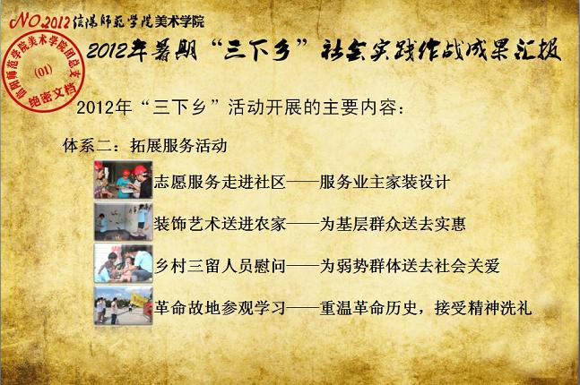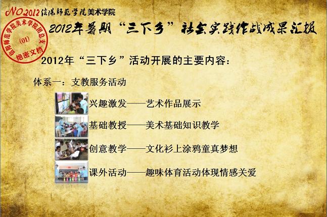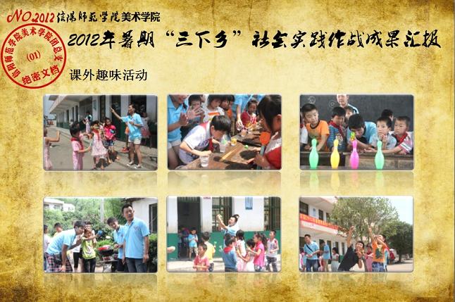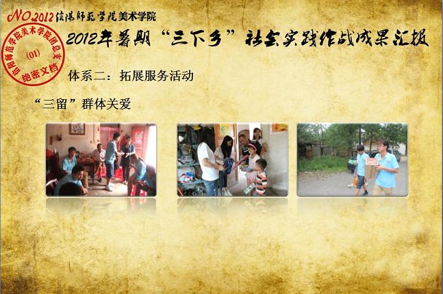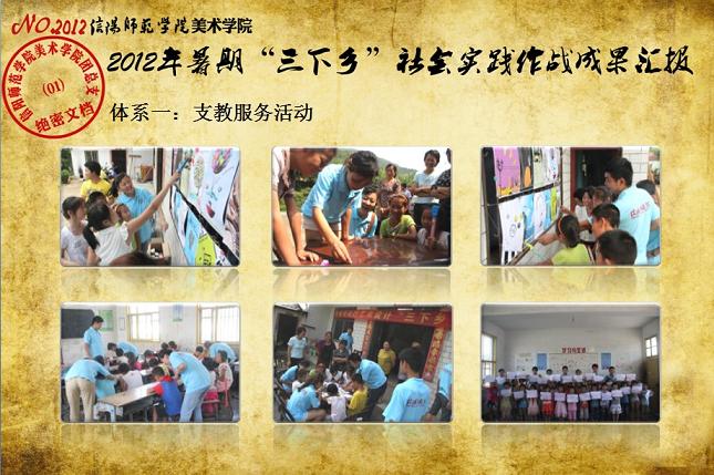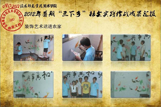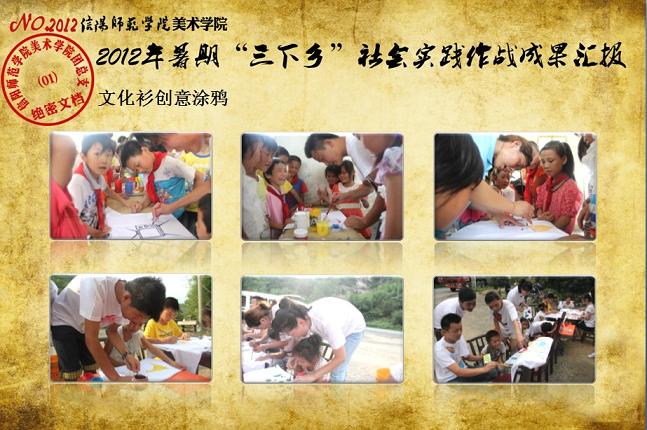 日前,我校《关于表彰信阳师范学院2012年大学生暑期“三下乡”社会实践活动先进集体和先进个人的决定》下达,我院2012年大学生暑期“三下乡”社会实践志愿服务队再次获评校“大学生暑期‘三下乡’社会实践活动先进集体”荣誉称号,志愿队一支队队长刘毅(2010级环境艺术设计班)同学获评“2012年河南省大中专学生暑期‘三下乡’和‘四进社区’实践教育活动先进个人”荣誉称号,齐东伟、周贤亮老师获评校“2012年大学生暑期‘三下乡’社会实践活动先进工作者”荣誉称号,陆杨等17名同学获评校“2012年大学生暑期‘三下乡’社会实践活动先进个人”荣誉称号。大学生暑期“三下乡”社会实践活动是高校实践育人的一个重要环节,是当代青年大学生深入基层、实践基层、服务基层,全面地了解社会、锻炼自我、促进自身成长与发展的一个有效平台。多年来,美术学院结合自身专业特色,将思想政治教育、专业技能实践、责任意识培养全面融入大学生暑期“三下乡”社会实践活动,形成了一系列广受社会欢迎和学校认可的特色品牌活动,2005年至今,美术学院已6次获评校大学生暑期“三下乡”社会实践活动先进集体。2012年暑期,美术学院团总支紧紧围绕“高举团旗跟党走、建功中原经济区”这一主题,结合“以支教服务为中心,充分发挥专业特色及队员特长,在扎实开展支教服务活动的同时,拓展性地开展各类有利于留守儿童情感关爱、有利于乡村基层文化建设、有利于青年学生思想成长的‘三下乡’志愿服务活动”的工作主线,组织志愿队员30余人,分两个支队分赴信阳市浉河区南湾村、信阳市建业森林半岛社区、信阳市光山县陈岗村小学、信阳市光山县刘邓大军王大湾会议旧址、信阳市新县鄂豫皖苏区革命纪念馆、信阳市新县浒湾乡等地开展了革命故地参观学习、艺术支教服务、志愿服务走进社区、装饰艺术送农家、“三留”人员情感关爱等一系列服务内容丰富、专业特色突出、教育主旨鲜明、服务成效显著的社会实践活动,受到了服务地干群的一致欢迎和认可。活动同时更得到了广大社会媒体的关注和支持,中新网、中原网、青年导报等多家新闻媒体对我院志愿队开展的一系列志愿服务活动进行了全面的宣传报道。