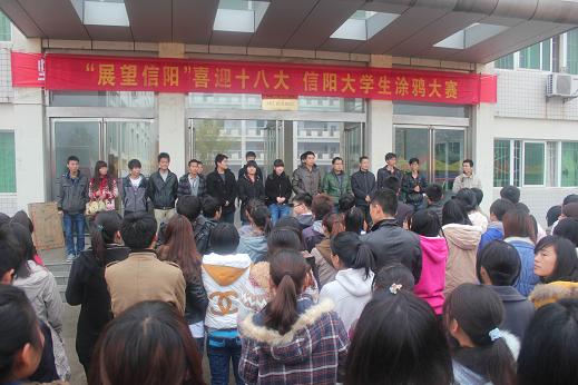11月10日,由信阳师范学院团委、信阳师范学院美术学院、信阳农业高等专科学校团委、信阳职业技术学院团委主办,信阳师范学院大学生美术爱好者协会承办的2012“展望信阳”喜迎十八大信阳大学生涂鸦大赛总决赛在信阳师范学院艺术楼前隆重举行。信阳师范学院、信阳农业高等专科学校、信阳职业技术学院、信阳师范学院华锐学院四所高校的团委负责老师及社团指导教师应邀参加了此次大赛的开幕式和作品评审,来自上述四所高校的200余名选手入围参加了此次总决赛。