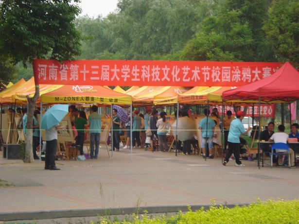校园涂鸦大赛是我省大学生科技文化艺术节中的主要赛事之一,美术学院在接到比赛通知后,在学院专业指导老师的悉心指导下集思广益,经过一个多月的精心准备,对创作作品进行反复的设计推敲和优化提升,最终邱星、孙超两同学的作品《红动中原》和靳凤、黄铭雅两同学的作品《中原崛起》晋级此次涂鸦大赛决赛。全省百余所高校,最终有作品晋级决赛的高校为28所、作品总计40件。