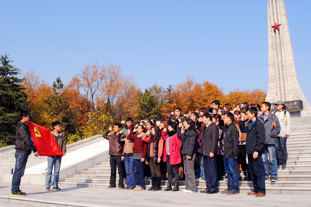 参观过程中,竹沟纪念馆内陈列展出的与竹沟根据地有关的实物、图片、绘画、文字、模拟场景、雕塑等物品,全面、准确地反映了竹沟革命根据地形成的过程和抗战时期中共中央中原局在竹沟领导中原人民发挥的重要历史作用,真实、形象、生动地再现了刘少奇、李先念、彭雪枫、王国华、周骏鸣等老一辈无产阶级革命家的光辉业绩,为在场的师生党员们再现了抗日军民在中国共产党领导下,奔赴前线开展斗争的宏伟场面,全面、细致、深入地重温了我党建设发展的红色革命历史。在竹沟烈士陵园内,仰望着笔挺耸立的纪念碑,回忆着艰苦卓绝的革命斗争年代,美术学院师生党员心中对革命先烈们的崇敬与爱戴不禁涌上心头,自发地在烈士陵园内举起右拳、面对党旗开展了重温入党誓词活动。在缅怀革命先烈的同时,自己更加坚定了努力工作、刻苦学习的责任意识,用实际行动积极投身到中国特色社会主义建设的浪潮中去。