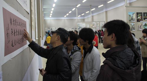 11月26日,由信阳高校联合主办,我校大学生书法协会、美术协会承办的“2011年‘申城杯’信阳大学生书画展”在我校艺术楼展厅隆重开展。河南大华书画院顾问、信阳市书画院顾问戴南园老先生,信阳市书法家协会姚学贤,信阳市浉河区书协主席吕玉中,信阳市平桥区老年书法诗词研究会副会长张德臣,信阳书画界人士宋连发、杨东平、陈思杰、唐葵、史光明、王成章等应邀出席了画展开幕式,画展同时吸引了来自信阳高校的500余名大学生书画爱好者前来观展。