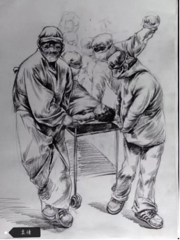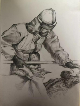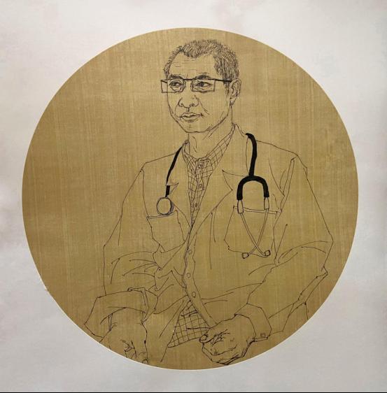 灵感:在抗疫这场战役中,白衣天使每天都要穿戴好厚重的防护服,本幅作品就是通过这一角度,把一线医生穿戴防护服这一场景绘成此画。