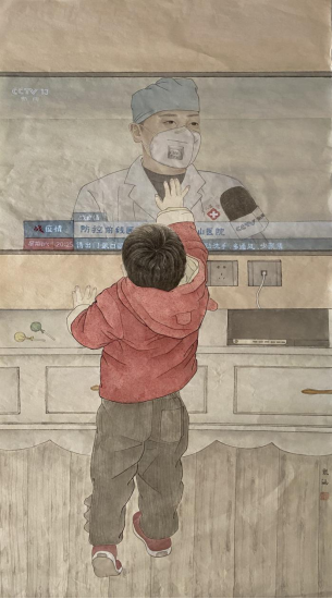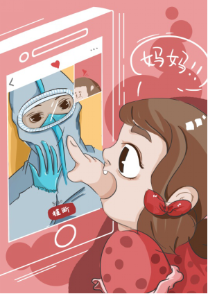 灵感:2020年,新型冠状病毒侵袭,掀起一场没有硝烟的“战争”,在疫情严峻的情况下,医护人员面对危险冲锋在第一线,他们舍小家为大家。有的医护人员担心从医院出来会有残留病毒传染给家人,所以不敢回家住,以至于很久没有跟家人见面。画中一个小女孩通过微信视频和妈妈见面,她好久没有见到妈妈了,尽管妈妈穿着厚重的防护服,戴着密不透风的口罩和护目镜,可小女孩还是一眼就认出了妈妈,激动的用手指着屏幕大声喊着妈妈,她很想念妈妈,而且她知道,她的妈妈是英雄。