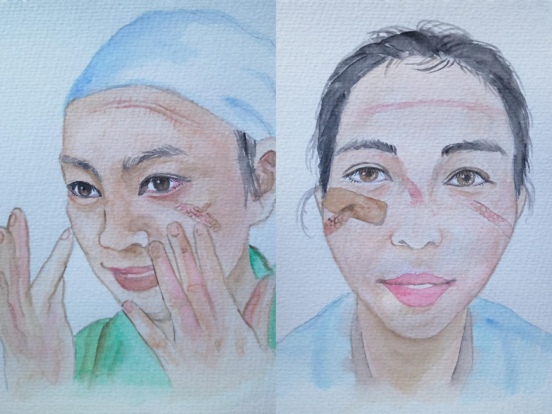灵感:医务人员里的护士大多数是女护士,她们在疫情面前勇于担当,防护面罩下的她们容颜不再美丽,出现一道道勒痕,但在人们心中她们是最美丽的天使!
