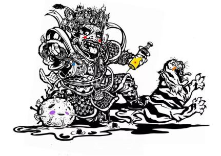 灵感:信阳位于河南南大门,画中人物是南方增长天王,其职责就是镇压南天门,如今河南信阳面对新冠病毒攻势犹如猛虎般的爆发,作者利用增长天王的驱魔辟邪的作用震慑恶虎般的疫情。