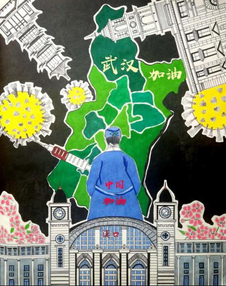 灵感:在这幅作品中,黄鹤楼,江汉关,汉口火车站都是武汉的地标性建筑,而手持针筒的医生最终将消灭病毒,春暖樱花开,我们将会迎来更美的武汉。
