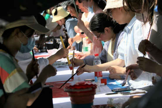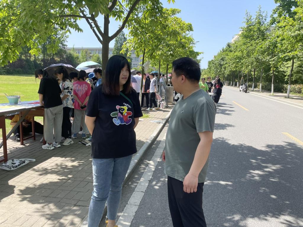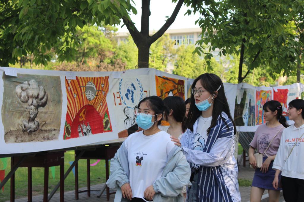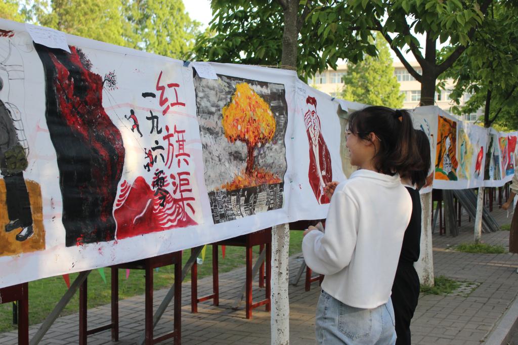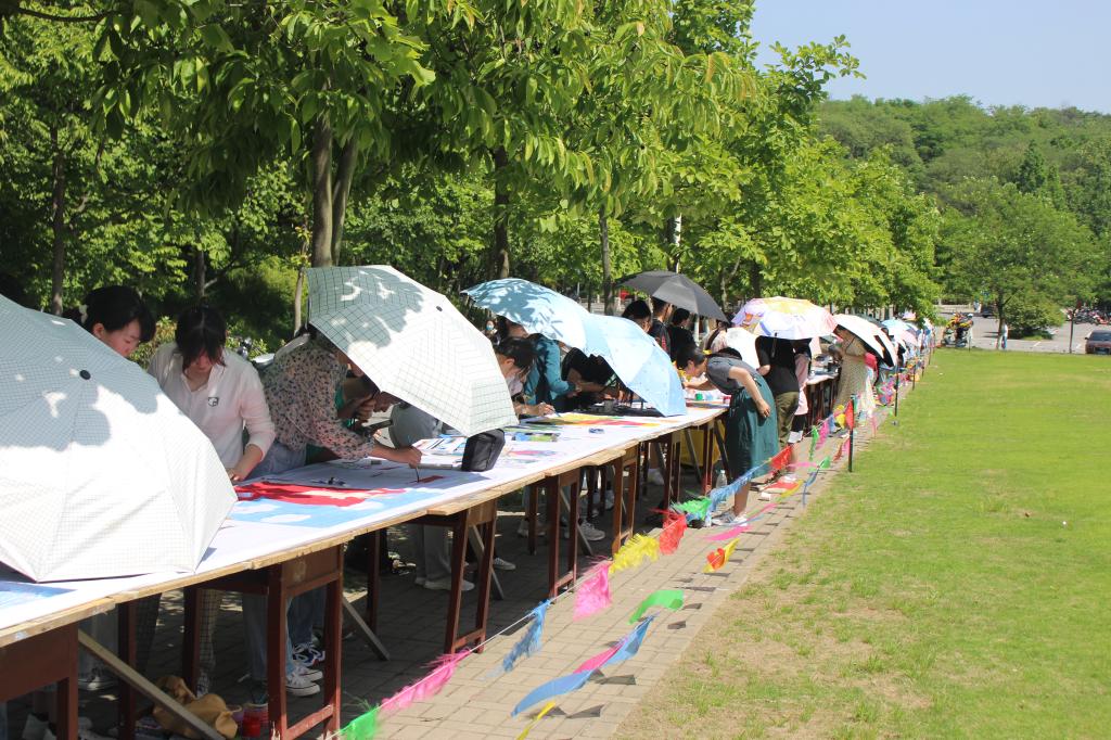 经过4个小时的不懈努力,一组内容丰富、技艺精湛、形式多彩连绵百余米的画卷在思齐路边悬挂展示,吸引大量师生、过往路人和小朋友前来观展投票,现场一片火热。