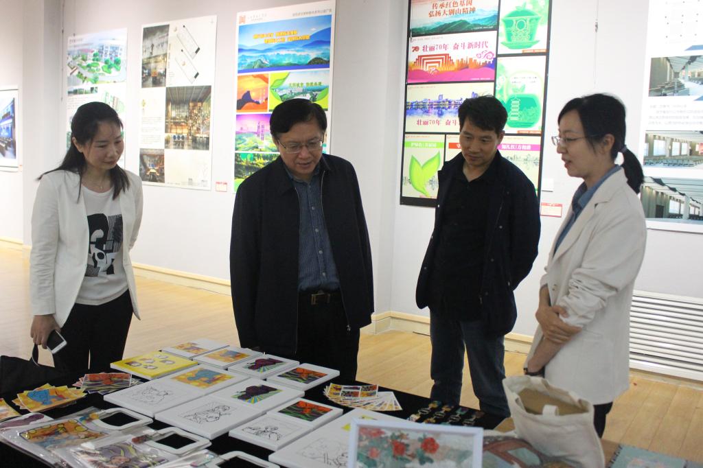 观展过程中,邹东升、张伟对展览的教师作品逐一进行了介绍,刘焱对学生文创作品进行了详细解说。钱长琨细致观摩了一幅幅作品,对展出作品给予了高度评价并提出具体指导意见和建议。他指出,本次展览主题鲜明,亮点突出,意义深远,以艺术的形式重温中国共产党的百年辉煌历史,践行初心使命,向建党100周年献礼,展示了williamhill威廉希尔师生的专业素养和精神风貌。学生文创作品新颖美观,个性突出,同时他建议更多地挖掘红色资源,利用红色元素进一步丰富红色文创产品。
