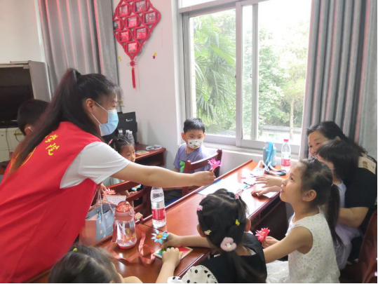 活动结束后,志愿者们通过古诗接龙游戏,向小朋友们送上亲手制作的棒棒糖花和七巧板等小礼品,给小朋友们带来惊喜。