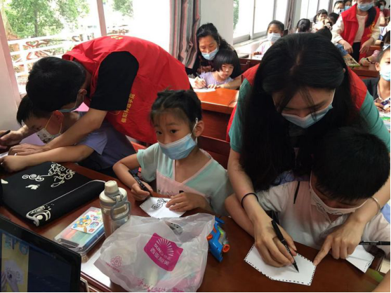 此次活动内容丰富,设有“童心抗疫”-多彩口罩主题绘画、“童心守护”-未成年人防溺水宣传、“童心关爱”-亲子手工制作、“童心滋养”-阅读分享一本好书、“童心向党”-聆听红色故事等5个环节。志愿者们带着水彩笔和空白口罩等工具材料走进社区,手把手帮助小朋友们进行了多彩口罩绘画创作,通过发放宣传单和现场讲解向在场的家长与小朋友们宣讲防溺水等知识。在其他活动环节,志愿者们则全程配合社区工作人员开展工作。在活动中小朋友们表现积极,脸上时刻洋溢着开心的笑容,现场气氛活跃。