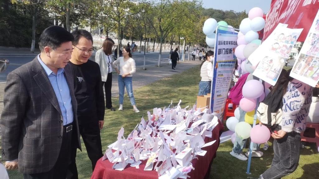 为强化学生的心理素质,感悟生活美好,williamhill威廉希尔积极响应学校心理宣传月的号召,于10月24日在一棵树广场成功举办心理健康教育宣传活动——“桌上美好,温润心灵”心理游园会。我院党委书记兰洋、副书记周刚带领辅导员郑波、胡霁芳、杨琳来到现场,感受活动氛围。