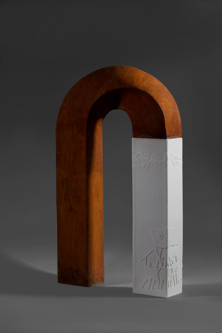张睿老师创作的《何惧岷山千里雪》陶艺作品运用综合材料的跨界与融合,陶瓷与耐候钢两种视觉效果差异较大的材质对比,显现出巨大的艺术张力,营造了红军翻越雪山时表现的不惧艰险,勇往直前的长征精神意象。作品拓展了陶瓷艺术的外延,体现出创作者独特、自由的表达风格。同时展示了红色陶艺创作的新思路,在现代陶艺框架下以强烈的视觉冲击力和悲怆的感染力,唤起人们对英雄的崇敬之情,彰显出“红色文化”符号的宝贵价值。